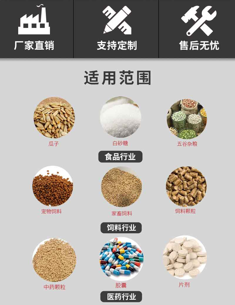 【物料要求】:顆粒(li)度物料,如食品,化工,建(jian)築類物料原料(liao)