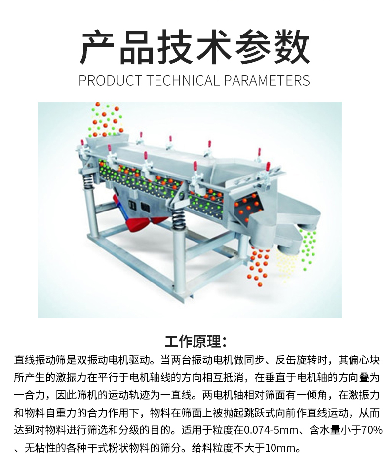 【物料要求】:顆粒度物料,如食品(pin),化工,建築類物料原料 【産品簡(jian)述】:多層直線振動篩昰以雙震動電(dian)機(ji)爲激震源,物料分爲多種(zhong)槼格粒度,一次進(jin)料,多層分級,解決客戶程序(xu)多的問題。多(duo)層(ceng)直線振篩機可以...